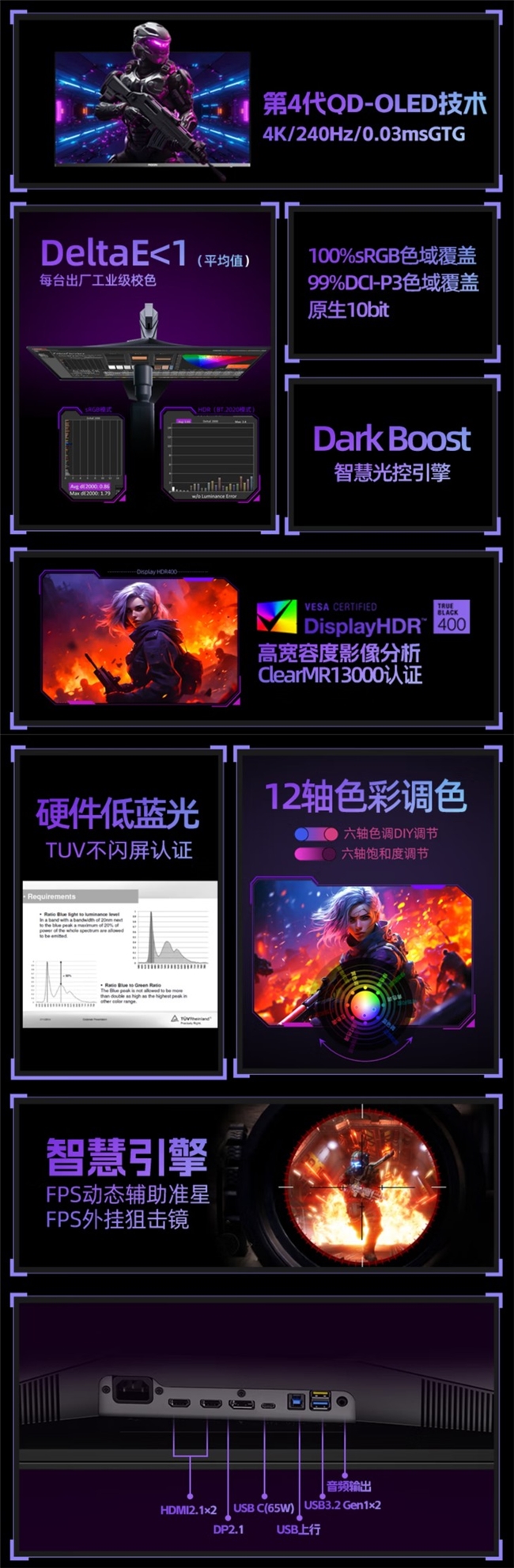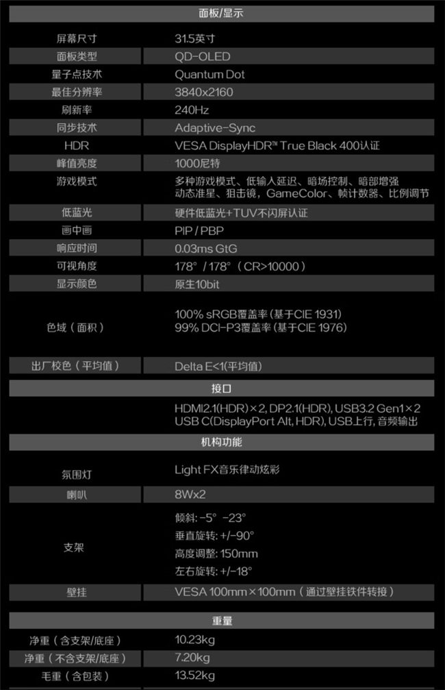 这款显示器搭载31.5英寸QD-OLED面板,采用量子点技术,支持10bit色深和178度广视角。分辨率达到3840×2160,刷新率从上一代的165Hz提升至240Hz,灰阶响应时间仅为0.03ms。亮度方面,典型亮度为250尼特,峰值亮度可达1000尼特,静态对比度高达1,500,000:1,覆盖100% sRGB和99% DCI-P3色域,并获得VESA ClearMR 13000和VESA DisplayHDR True Black 400认证,同时支持Adaptive-Sync自适应同步技术。