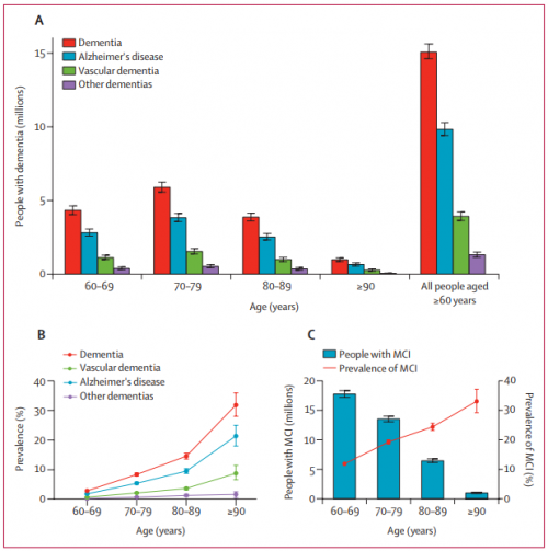 图1.按年龄组划分的痴呆及MCI的估计患病率与患病人数。A.按年龄组划分的痴呆、AD、VaD及其他类型痴呆的估计患病人数;B.按年龄组划分的痴呆、AD、VaD及其他类型痴呆的患病率;C.按年龄组划分的MCI患病率及估计患病人数。误差线代表95%置信区间(95% CIs)[3]。