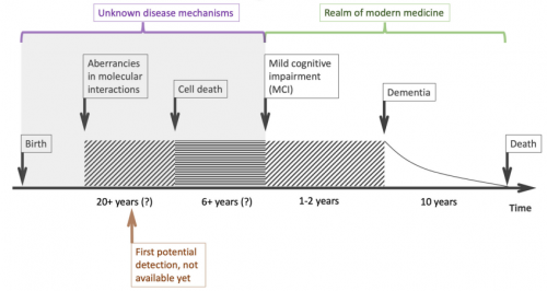 AD是一种慢性疾病,具有漫长的临床前和前驱期(20年),临床病程平均持续8至10年[4]。其病理过程始于异常的分子相互作用,最终导致神经元死亡。然而仅当大脑遭受足够严重的损伤后,患者才会表现出MCI(图2)[5]。