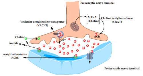图4.ACh在突触前神经末梢与突触后神经末梢之间合成与运输的途径[7]