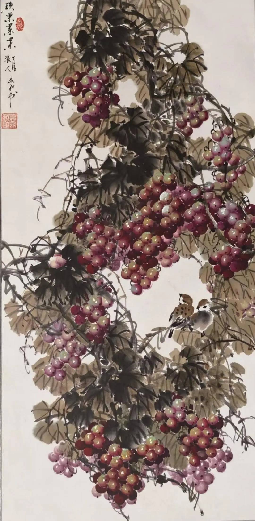 《硕果累累·葡萄》能在国际展场中脱颖而出,其构图逻辑的突破是关键——它打破了传统花鸟画“折枝式”的自然布局,以“隐性几何框架+文人留白”的双重结构,构建了传统与现代的视觉对话场域。